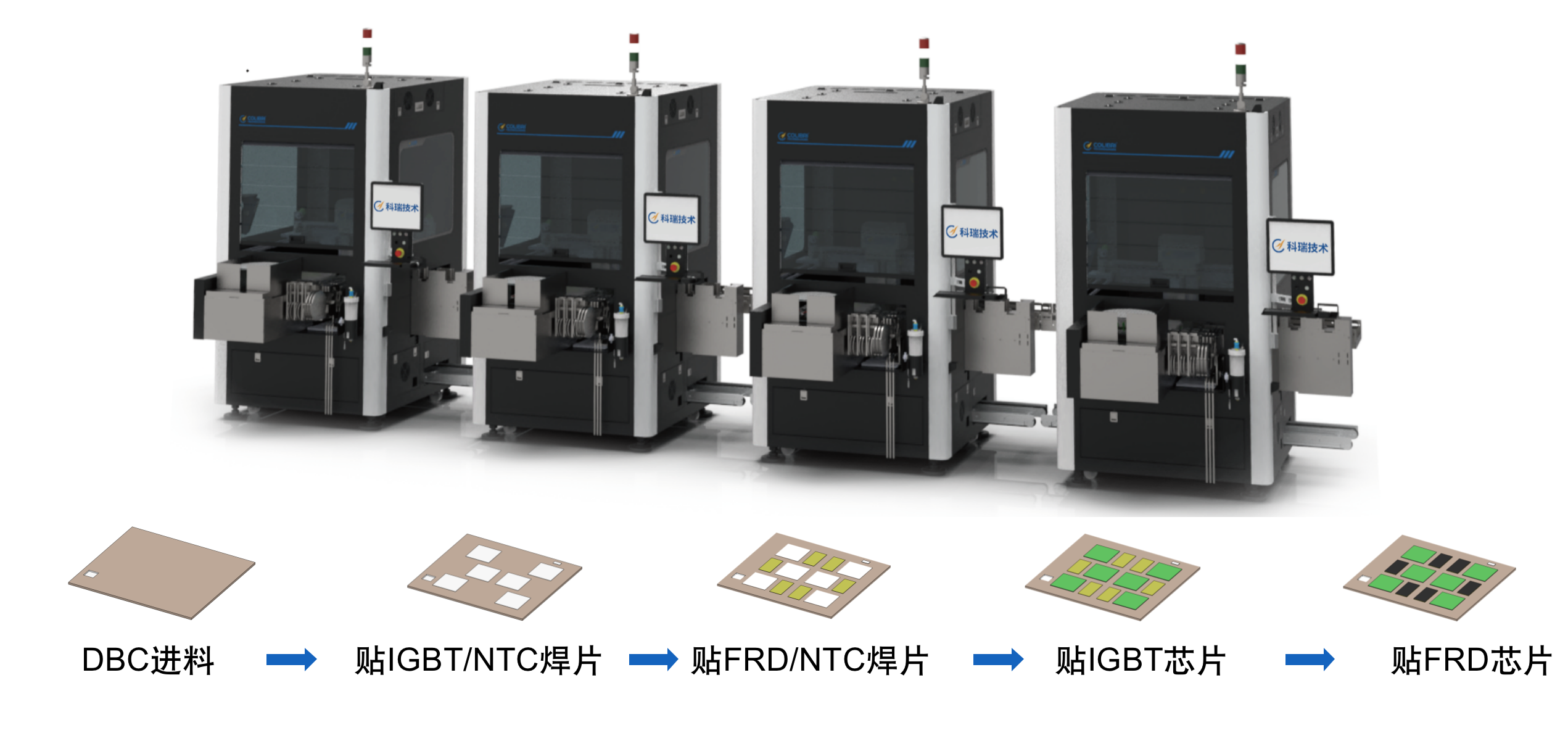 線體由多臺芯片焊片多功能貼裝設(shè)備組成,可根據(jù)不同的工藝流程靈活串線,滿足不同工序的CT差異,實現(xiàn)單一動作完成復雜貼裝流程,最大效率利用設(shè)備,提高產(chǎn)能。設(shè)備自帶下層載具回流功能,與前后自動上下料設(shè)備對接,實現(xiàn)整線全自動作業(yè)。