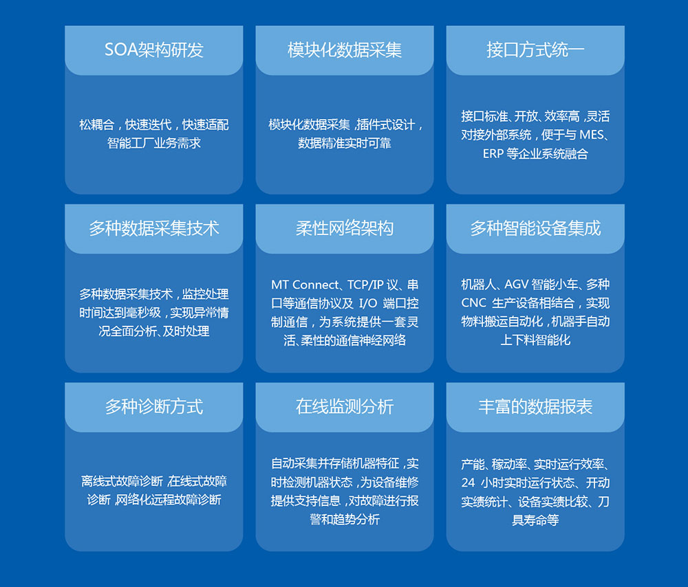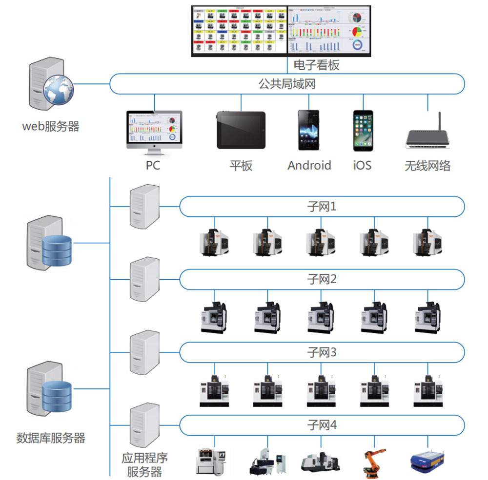 公司技術(shù)SCADA(Supervisory Control And Data Acquisition)數(shù)據(jù)采集與監(jiān)控系統(tǒng)將所有機床及相關(guān)設(shè)備數(shù)據(jù)連接在一起,實現(xiàn)車間可視化,生產(chǎn)透明化,設(shè)備狀態(tài)及報警信息實時化,產(chǎn)能、OEE及稼動率的統(tǒng)計動態(tài)化,加工信息及設(shè)備信息可追溯化,并可通過遠程終端或智能手機等移動通信體讓生產(chǎn)調(diào)度對生產(chǎn)現(xiàn)場進行遠程監(jiān)控和快速響應(yīng),從而對生產(chǎn)車間進行全面、及時、有效的管理,達到可視化節(jié)能生產(chǎn),為實現(xiàn)智能制造自動化無人工廠提供軟件系統(tǒng)支持。