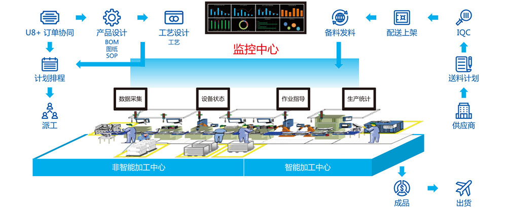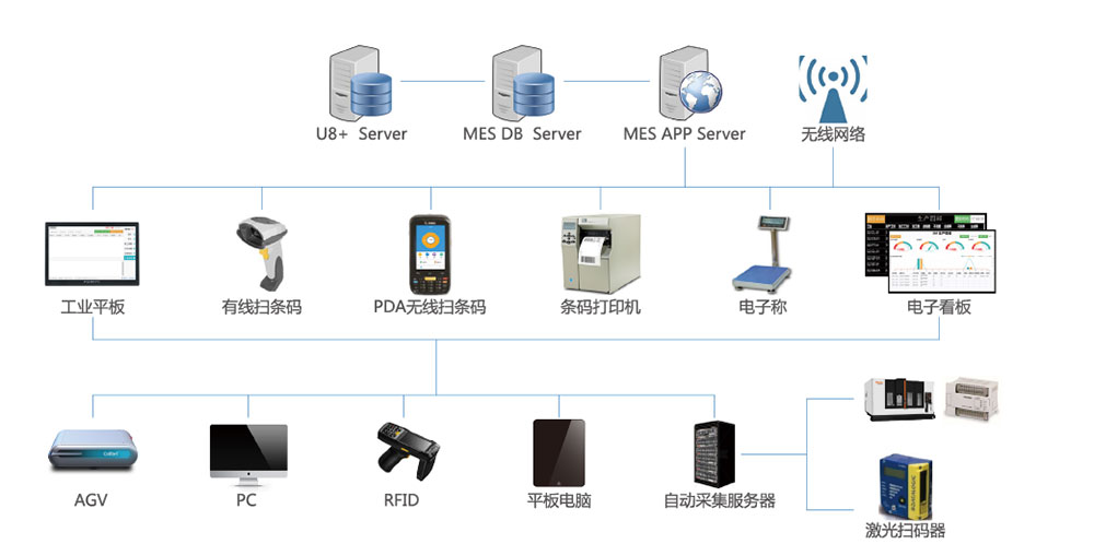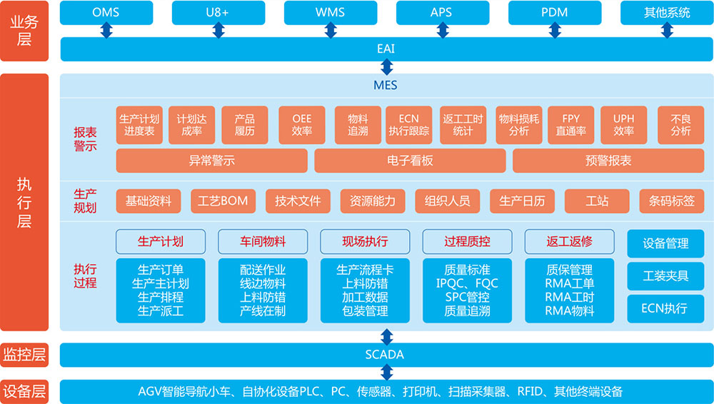 智能制造不但要生產(chǎn)自動(dòng)化、信息化,更需跨業(yè)務(wù)層級(jí)整合信息系統(tǒng),實(shí)現(xiàn)業(yè)務(wù)層、執(zhí)行層、監(jiān)控層、設(shè)備層的互聯(lián)互通。MES系統(tǒng)是鏈接業(yè)務(wù)層與設(shè)備監(jiān)控層的橋梁,通過(guò)MES可以實(shí)時(shí)掌控生產(chǎn)進(jìn)度與監(jiān)控異常。
